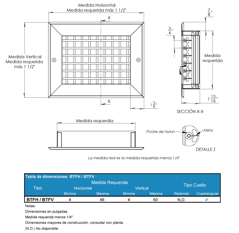 La rejilla de inyección de doble deflexión en acero inoxidable, será de marca Innes, modelo BTFH (aletas horizontales) y BTFV (aletas verticales). La rejilla tendrá aletas individualmente ajustables sobre 3/4”. La construcción será de acero inoxidable 304 con bordes de 1-1/4 " por lado y esquinas en escuadra. La rejilla estará disponible con agujeros de tornillo avellanados para un aspecto limpio y libre.