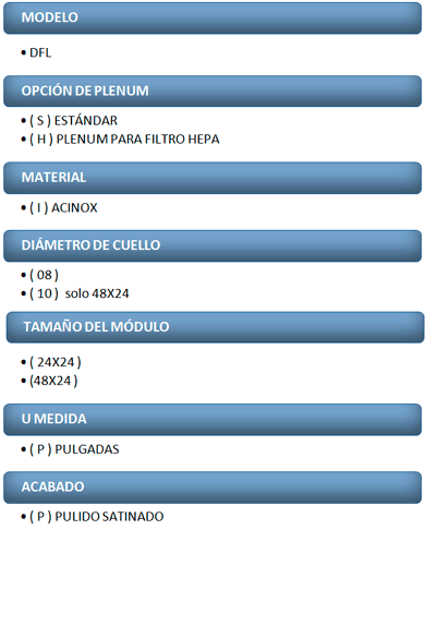 Los difusores de flujo laminar para ambientes críticos serán de marca INNES. Las unidades instaladas proveerán una línea al nivel con el sistema de techo, los difusores que no están al ras, no serán aceptables. La unidad consistirá en el ensamblado de placa y ensamblado backpan (plenum). El ensamblado de placa deberá ser en fabrica y colocado en el backpan del difusor y ser entregado y listo para su instalación. El ensamblado de placa frontal será diseñado en una sola pieza con un marco solido integral de perímetro. Las perforaciones de la placa frontal serán 1/16” y los agujeros de diámetro en 1/8” entre los centros. El montaje de la placa frontal será desprendible con herramientas comunes. Deberá ser asegurado con los tornillos cuarto de vuelta en acero inoxidable y deberá incluir los cables de seguridad, sujetados al ensamble del plenum. El montaje plenum del difusor será fabricado como una sola unidad. La unidad estándar consistirá en el ensamble del marco trasero, un bafle de cono integral y un collarín de 2 pulgadas de alto para permitir una conexión segura de conducto. |