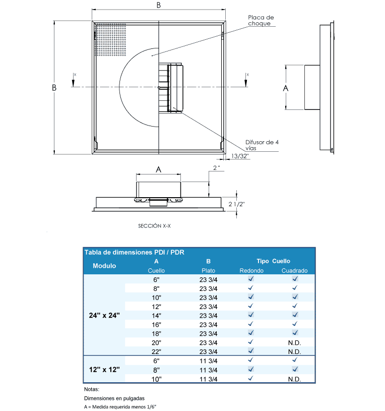 Se manejarán dos tipos de PD, siendo el PDI para identificar el difusor perforado de inyección y el PDR para identificar el difusor perforado de retorno. El difusor perforado de inyección (PDI) incluirá un deflector ajustable en campo en aluminio o acero, el cual dirigirá la descarga por 1, 2, 3, o 4 vías o un deflector tipo placa de choque en acero inoxidable. El difusor perforado de retorno (PDR) no tendrá deflector.