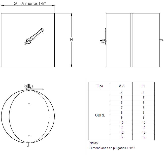 La compuerta de balance redonda para uso ligero CBRL es una opción económica para regulación y balanceo de aire. Las medidas disponibles son diámetros de 4” a 14” en incrementos de 1”. Está fabricada en acero galvanizado de calibre 24 y cuenta con cuadrante manual ligero.
