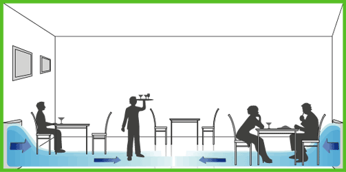 - El ángulo de 90 grados del patrón de flujo permite alcanzar un caudal de aire elevado a baja velocidad residual en la zona de ocupación. |