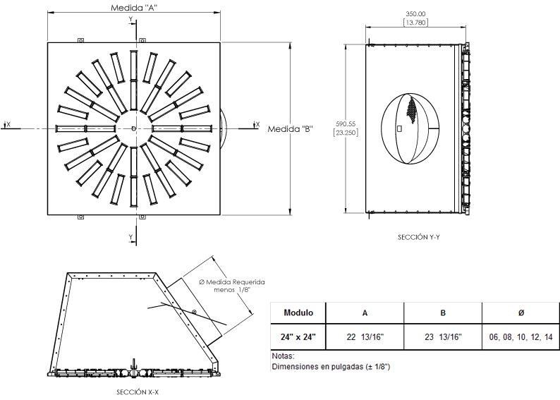 Está disponible para plafón corrido, en donde la placa del difusor queda por debajo del plafón (ver diagrama de instalación) o plafón reticular en el cual la placa del difusor descansa sobre la "T" del plafón (ver diagrama de instalación). El cuello es redondo con dimensiones de 6" a 14" pulgadas en incrementos de 2".