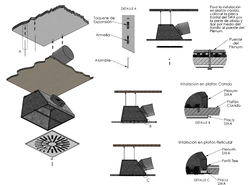 El Difusor SWA-D está fabricado en lámina de Acero en la placa frontal con pintura electrostática en color blanco de línea, Plenum en lámina de Acero Galvanizado Calibre 22 en acabado natural. |