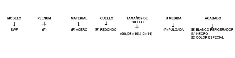 El Difusor SWF está fabricado en lámina en Acero Galvanizado Calibre 22 en la placa frontal, pintura electrostática en colores de línea: blanco, blanco tablaroca o negro mate. El Plenum está fabricado en lámina de Acero Galvanizado Calibre 22 en acabado natural.