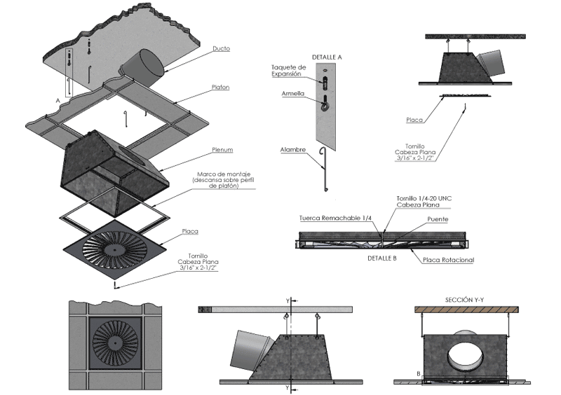 Está disponible en módulos de 24"x24" para instalación en plafón corrido o reticular. Cuenta con un Plenum de 23 1/4" x 23 1/4" x 14", la conexión del plenum es redonda con dimensiones de 6" a 14" pulgadas en incrementos de 2".