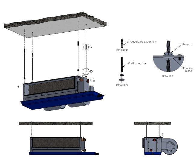 El sistema Fan & Coil estará construido en acero galvanizado y el serpentín en tubería de cobre, aletas de aluminio y conexiones de lado derecho e izquierdo.
