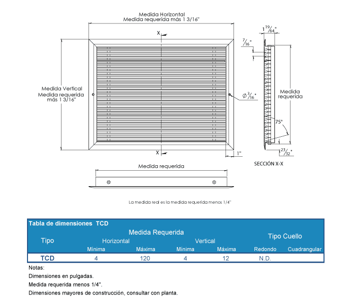 Las rejillas lineales perimetrales para inyección o retorno tipo TCD y TCS son una excelente opción para aplicaciones en techo o muro. Su núcleo es fijo y el diseño de sus barras permite obtener una deflexión de 15°.