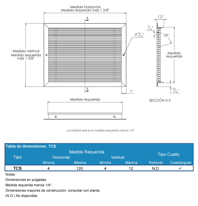 Los tamaños de construcción estarán disponibles desde 4” x 4” hasta 120” x 12” en incrementos de 1”. Las barras lineales serán de 1/4” con una separación de 7/16 entre ellas.