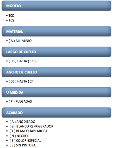 Las rejillas TC estarán construidas en aluminio extruido con acabado natural o en pintura electrostática en colores de línea: blanco, blanco tablaroca o negro mate.