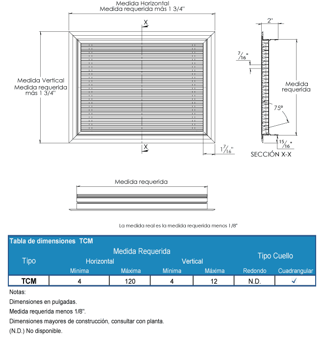 Los tamaños de construcción estarán disponibles desde 4” x 4” hasta 120” x 12” para las rejillas TCM y de 8” x 8” hasta 24” x 24” para las rejillas TCMB, ambas en incrementos de 1”. Las barras lineales serán de 1/4” con una separación de 7/16 entre ellas.