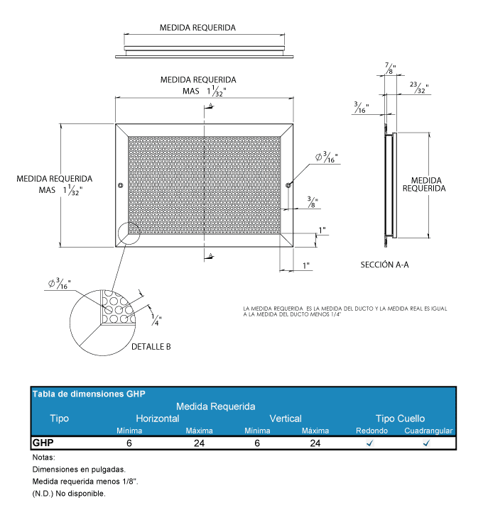 Los tamaños de construcción disponibles son desde 6” x 6” hasta 24” x 24” en incrementos de 1”. Pueden fabricarse con marco extruido (GHP), marco extruido desmontable (GMP) ó contramarco (GQP).