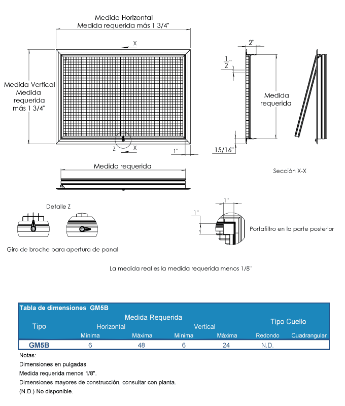Las rejillas tipo cuadrícula para retorno o extracción modelo GM5B son una excelente opción para cualquier aplicación que requiera retornar o transferir altos volúmenes de aire. Su marco es abatible e incluyen un poltrafiltro de 1”.
