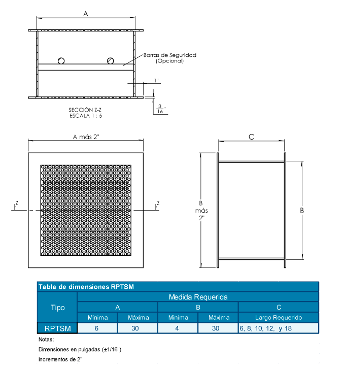 Las rejillas de seguridad de transferencia serán de la marca Innes modelo RPTSM y estarán fabricadas con una placa frontal y una posterior de lámina de acero con espesor 3/16" o acero inoxidable 304 en calibre 10 con perforaciones redondas de 5/16", separadas 7/16" entre centros desfasados. Contarán con un área libre de aproximadamente 46%. La rejilla llevará una manga según especificaciones del plano de 6", 8",10",12"ó 18" y estará unida a la placa anterior por medio de soldadura continua bajo los estándares de la ASTM.