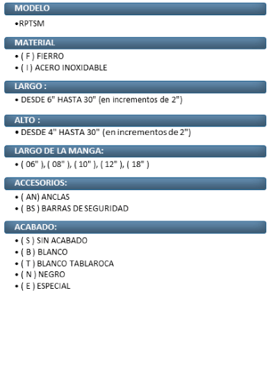 - Manga en lámina de acero (espesor 3/16") o acero inoxidable (calibre 10) de 6”, 8”, 10”, 12” o 18” de longitud.