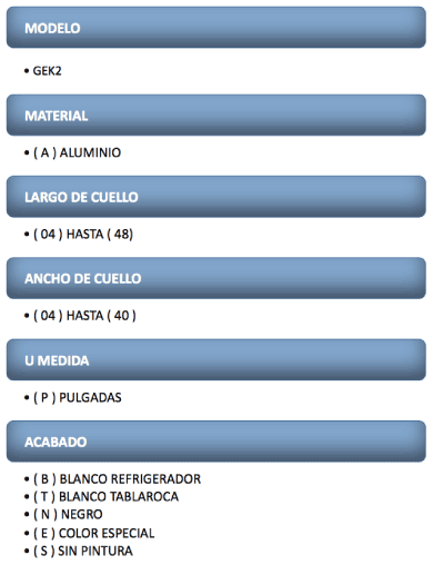 Las rejillas GEK2 estarán construidas en aluminio extruido con acabado en pintura electrostática en colores de línea: blanco, blanco tablaroca o negro mate.