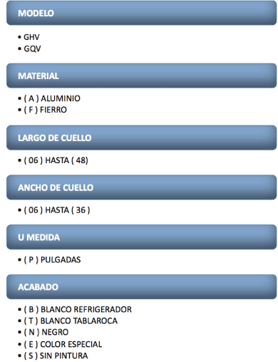 Los tamaños de construcción disponibles son desde 6” x 6” hasta 48” x 36” en incrementos de 1” Las rejillas GHV y GQV son fabricadas con panal “V” tipo no visión en acero, acero inoxidable o aluminio. Su acabado es pintura electrostática en colores de línea: blanco, blanco tablaroca y negro mate.