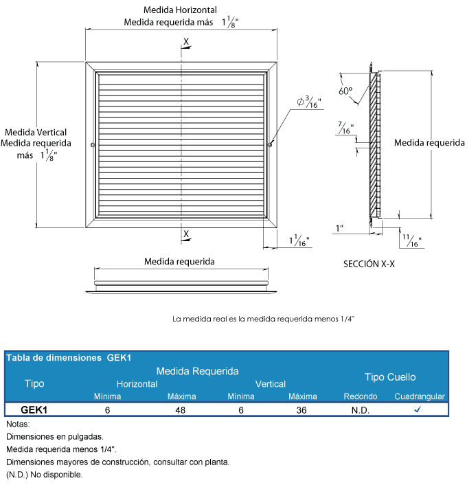 Las rejillas tipo aleta fija modelo GEK1 de uso rudo son una excelente opción rudo y toma de aire exterior. Sus aletas tienen una inclinación de 30° y separación entre sí de 1/2”.