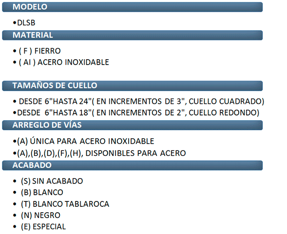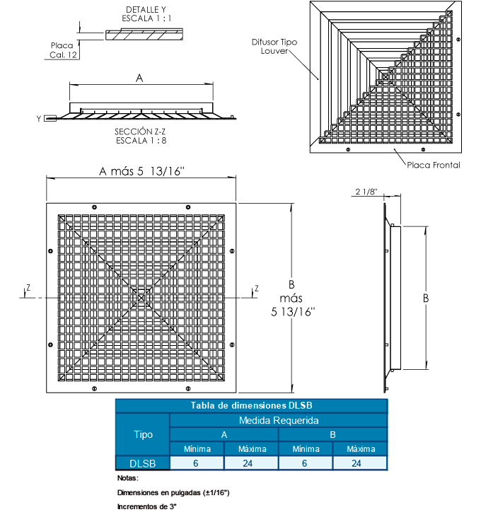 Los difusores tipo Louver de Seguridad marca Innes Modelo DLSB serán instalados donde el nivel de seguridad requerido sea de medio a bajo. Contarán con un cuello cuadrado desde 6"x6" hasta 24"x24" en incrementos de 3". Para instalación a ducto redondo se suministrará con una tapa con conexión redonda desde 6" hasta 18", en incrementos de 2".