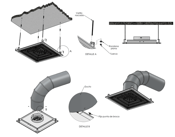 Su construcción será en aluminio. El difusor consta de una placa frontal desmontable; en lámina galvanizada Calibre 12 con perforaciones cuadradas de 13/16" separadas 1" entre sí.